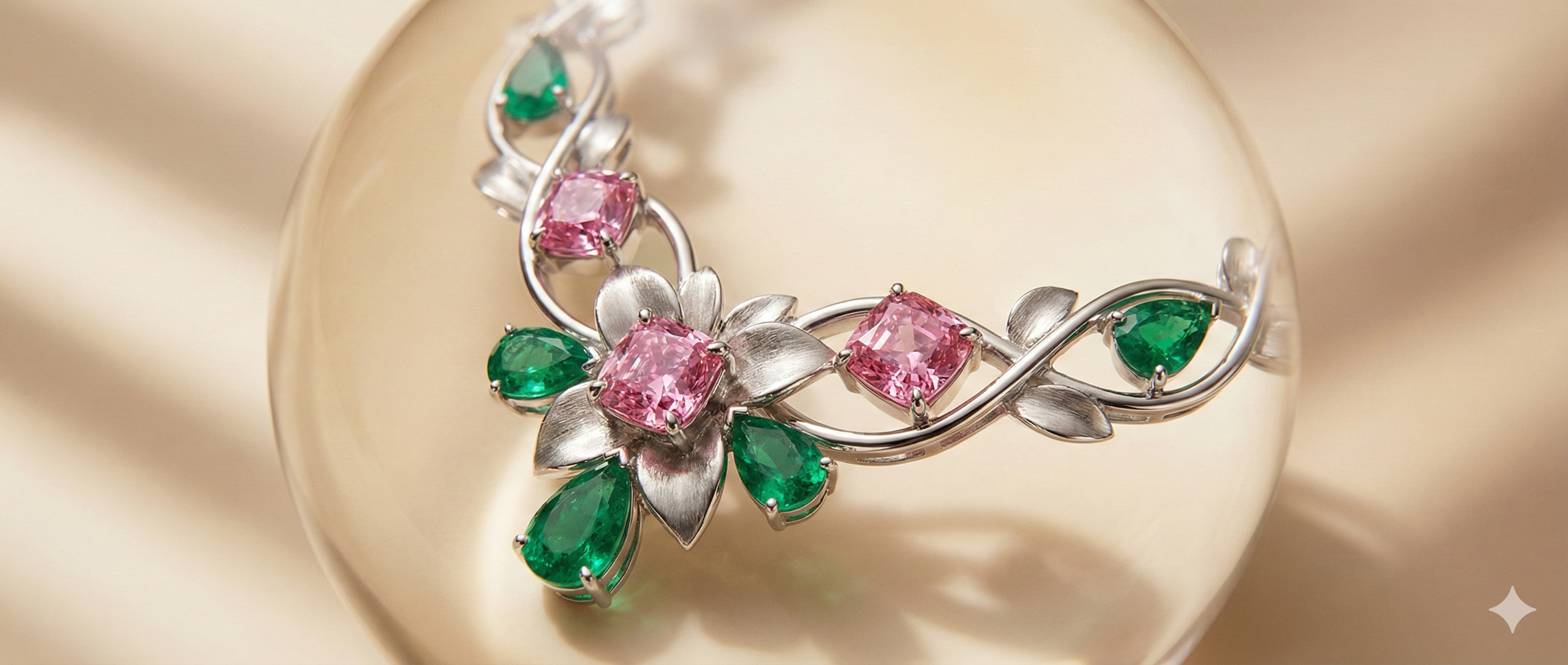 An intricate garland of brushed silver leaves, highlighted with marquise-cut emeralds.